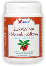 Żurawina i błonnik jabłkowy to unikalna kompozycja zmikronizowanych owoców żurawiny i błonnika jabłkowego. Oprócz wszystkich zalet błonnika, umożliwia nam dostarczenie zbawiennych dla zdrowia antyoksydantów. Owoc żurawiny zawiera tak wiele różnych cennych składników dla zdrowia człowieka, że zaliczany jest do roślin leczniczych. Owoce żurawiny są bogatym źródłem witaminy A i C, witamin z grupy B- kompleks (B1, B2, B6). Zawierają karotenoidy, sole mineralne, kwasy organiczne, a zwłaszcza kwas ascorbinowy i cytrynowy, które mają działanie przeciwgorączkowe i wzmacniające siły odpornościowe organizmu. Żurawina jest doskonałym źródłem antocyjanów i katechin, usuwa wolne rodniki, które powodują uszkodzenie białek, lipidów oraz DNA. Antocyjany opóźniają procesy starzenia, regulują gospodarkę tłuszczową, usuwają metale ciężkie. Natomiast flawonoidy występujące w żurawinie są podobne budową do tych występujących w czerwonym winie – a więc odpowiedzialnych za zmniejszenie zapadalności na choroby wieńcowe. Obecność błonnika zwiększa perystaltykę i przyspiesza proces wydalania masy pokarmowej. Błonnik po spożyciu chłonie wodę i pęcznieje w przewodzie pokarmowym dając poczucie sytości - zapobiega tyciu. Błonnik zwiększa perystaltykę i przyśpiesza proces wydalania masy pokarmowej. Skraca to czas kontaktu toksycznych substancji ze ścianą jelit, czas absorpcji tłuszczów, zmniejsza wchłanianie cholesterolu i triglicerydów. Błonnik jest prebiotykiem przyczyniającym się do rozwoju mikroflory jelitowej, tworząc naturalne podłoże i pożywkę dla bakterii probiotycznych. Codzienna dieta każdego człowieka różni się od siebie, dlatego dawkowanie, należy dostosować do indywidualnych potrzeb. Zacząć od małych porcji (1 łyżeczka ok. 3,5g dziennie) i stopniowo zwiększać do uzyskania optymalnych rezultatów. Błonnik wymieszać z wodą, innym napojem lub jogurtem. Każdorazowo popić szklanką wody. Nie spożywać na sucho. Nie należy przekraczać porcji 8 łyżeczek dziennie. Przechowywać w szczelnie zamknięty