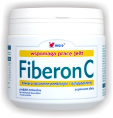 Fiberon C wspomaga pracę jelit, przywraca prawidłową perystaltykę, wzbogaca dietę w probiotyczne bakterie i błonnik. Wspomaga kuracje odchudzające i oczyszczające. Fiberon C jest mieszaniną roślinnych składników, łupin babki płesznik Plantago psyllium, bakterii jelitowych z rodzaju Lactobacillus i Bifidobacterium (probiotyków) oraz fru-ktooligosacharydów (prebiotyków) z cykorii i akacji będących pożywką dla bakterii. Odpowiedni dobór bakterii jak i prebiotyków ułatwia utrzymanie w jelitach odpowiedniego poziomu zarówno kwasu propionowego (działa przeciwzapalnie, przeciwbólowo i pleśniobójczo) jak i butyrylowego (stymuluje układ odpornościowy jelit oraz hamuje rozwój bakterii patogennych). Błonnik nierozpuszczalny zawarty w preparacie Fiberon C pobudza ściany jelit i poprawia perystaltykę jelit, zaś błonnik rozpuszczalny tworzy dużą ilość delikatnego śluzu, który ułatwia przemieszczanie się masy pokarmowej, redukuje zaparcia oraz skraca pasaż jelitowy. Sugerowana dawka dzienna preparatu-10g zawiera 8,5g błonnika pokarmowego, co stanowi około 30% zalecanej dawki dziennej.